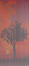 Houd vliegen buiten de deur met dit mooie vliegengordijn. Dit vliegengordijn is gemaakt van bamboe. Op de bamboe hulsjes zie je een boom staan tijdens zonsopkomst.