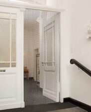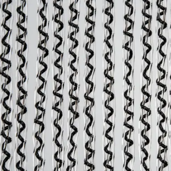 pvc vliegengordijn gemaakt van buigzaam kunststof. De strengen bestaan uit rond gedraaide kunststof draden. In het kunststof zit een dun zwart zigzagkoord verwerkt. Dit koord zorgt ervoor dat het vliegengordijn bij warmte of kou niet gaat krimpen of uithangen. De strengen hebben een luxe, chique uitstraling. Het geheel hangt aan een brede ophangcassette.